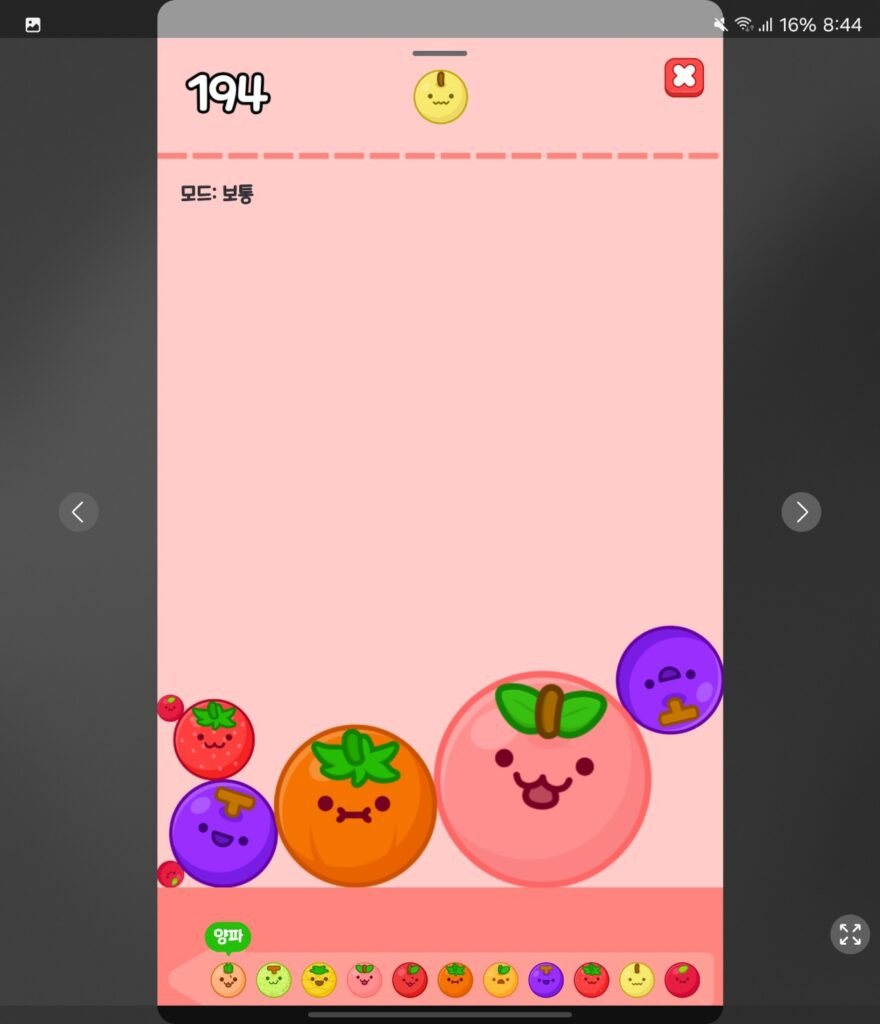 한쪽에만 계속 모이다보면 밑으로 누르는 힘이 커지면서 반대쪽 친구들은 반대로 위로 올라가는 힘이 생기게 되는데 이것을 잘 이용하면 좋습니다.(위에 사진에서는 왼쪽에만 떨어뜨리니까 오른쪽 과일들이 밀려서 위로 올라가게 됩니다)